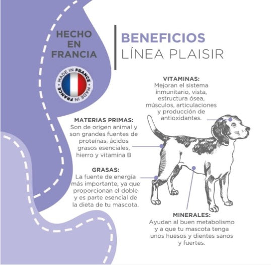 El alimento húmedo para perro de Plaisir ofrece todos los beneficios de una nutrición completa y balanceada. Deliciosa receta con textura de paté con ingredientes de primera calidad, una excelente fuente diaria de vitaminas y minerales. Formulada por Veterinarios con ingredientes locales, directamente de Normandía, Francia.